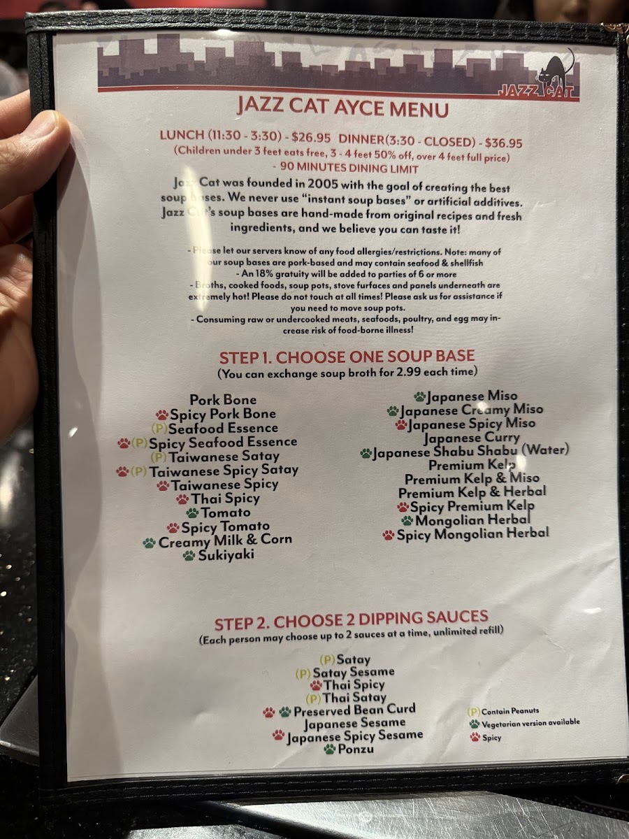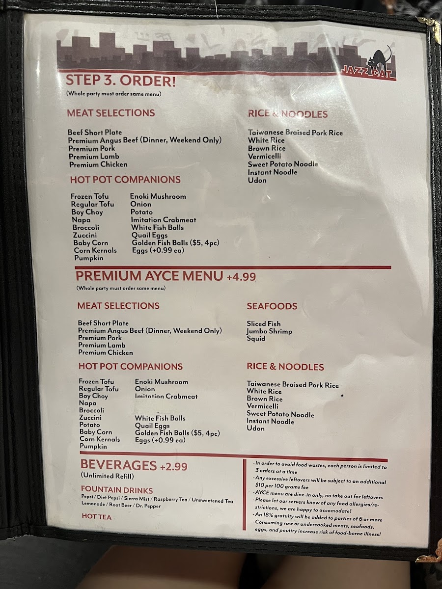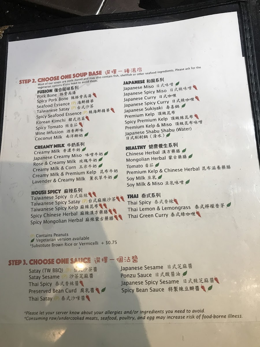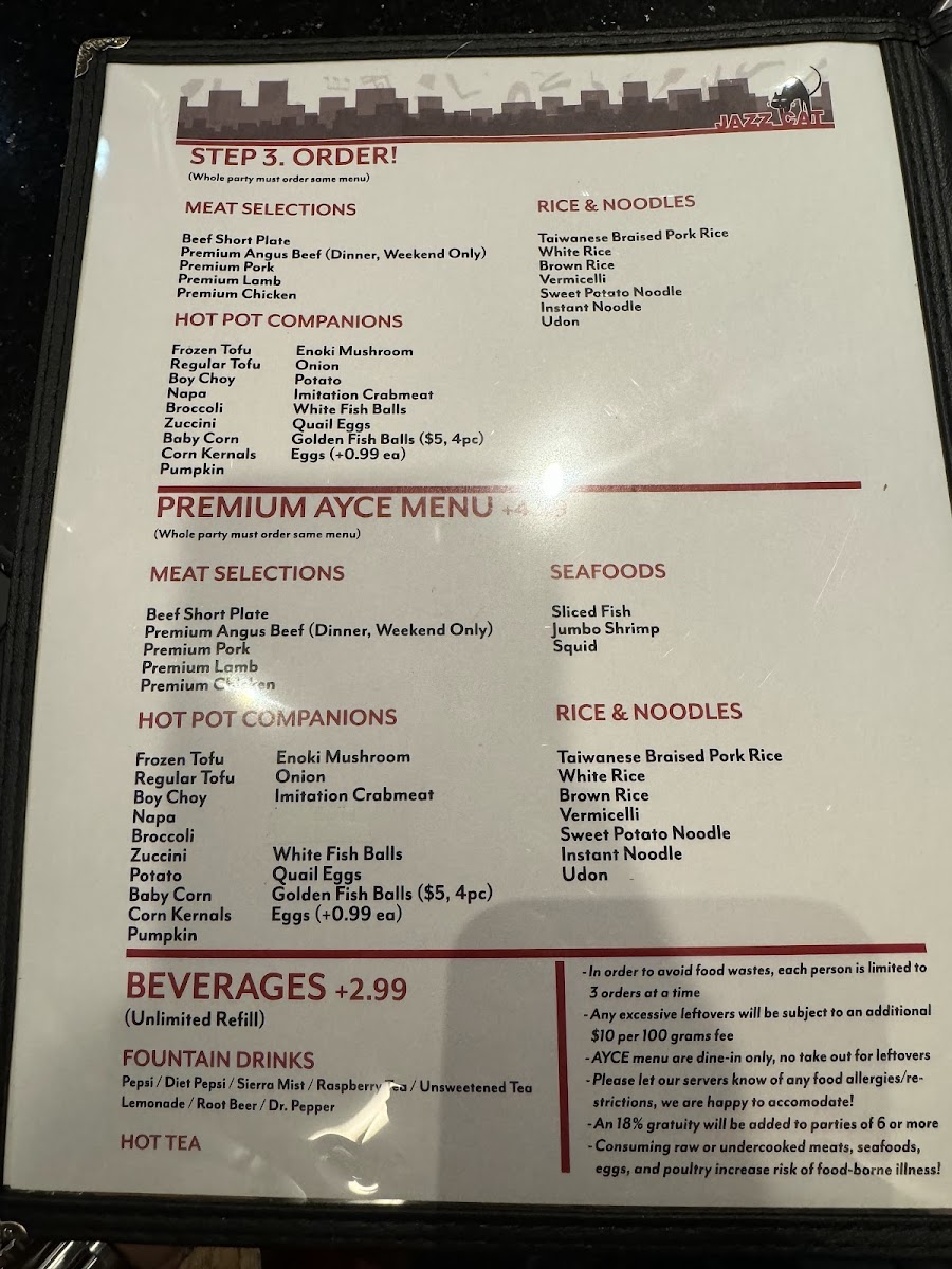 The menu is structured to accommodate casual dining experiences, suitable for groups or individual diners seeking a hot pot meal. It is appropriate for lunch, dinner, or any occasion when a hot pot meal is desired. Visitors typically choose from preset hot pot bases or customized builds, alongside side dishes and drinks, for a complete dining experience.